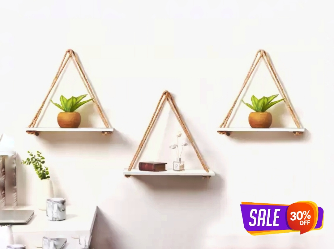 Hanging Shelyes handmade from reclaimed natual light wood, each chic set adds rustic charm to your modern boho decor. Macrame cotton rope and waterproof protective clear coat as a finishing touch • Each sturdy wooden shelf measures 12 inches, holds up to 8 pounds, the ropes adjust in length. The simplicity of the shelves complements and accentuates any classic or bohemian design style. • Easy to install, includes 4 hooks for quick and easy on drill wall setup. Each customizable rope hanging shelf can be hung as triangle criss cross, parallel swing, or 2-tiered. Command hooks also work • Thoughtfully packaged in a minimalist kraft style box. Great present for plant lovers into unique aesthetic home decor. A cute gift of creativity for birthdays, holidays, housewarming, or just because