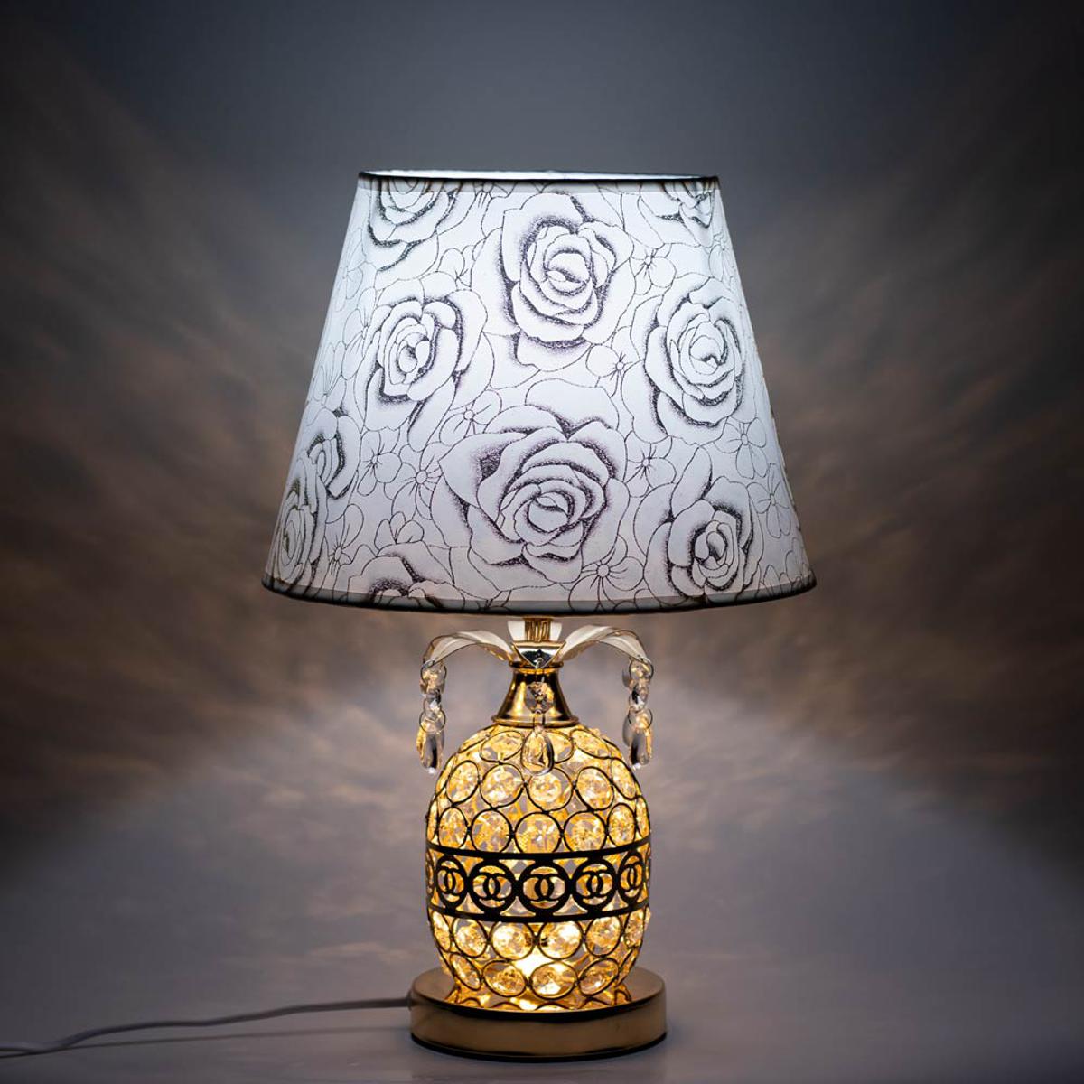 Crystal Stone Design Golden Color Metal Body With White Golden Designed Shade Table Lamp