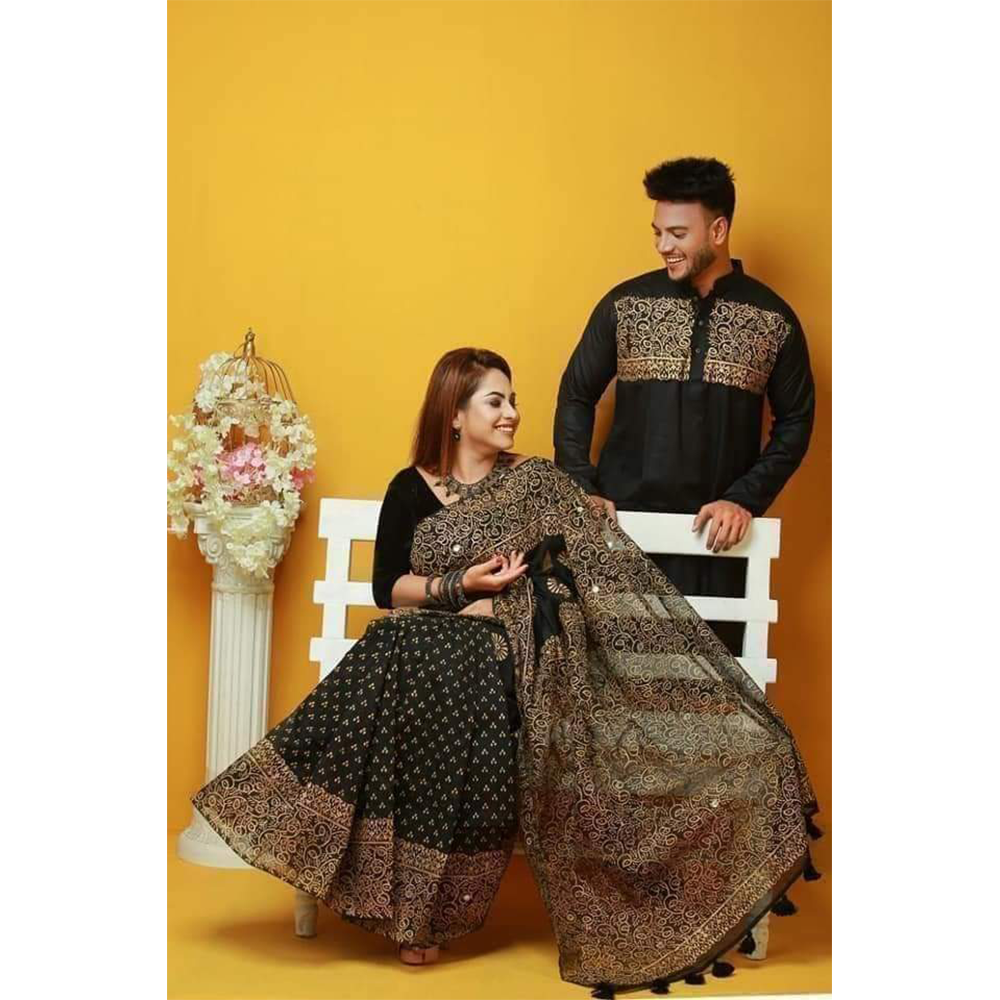 Dhupian Half Silk Block Print Cotton Couple Set Saree and Panjabi - 334