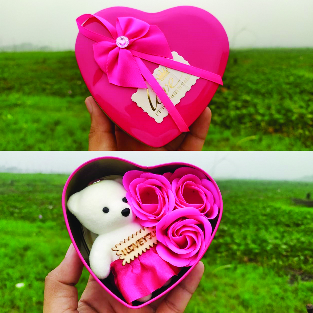 - Package contents: 1 x Cute Teddy Bear in a shape box + 3 x Artificial flower