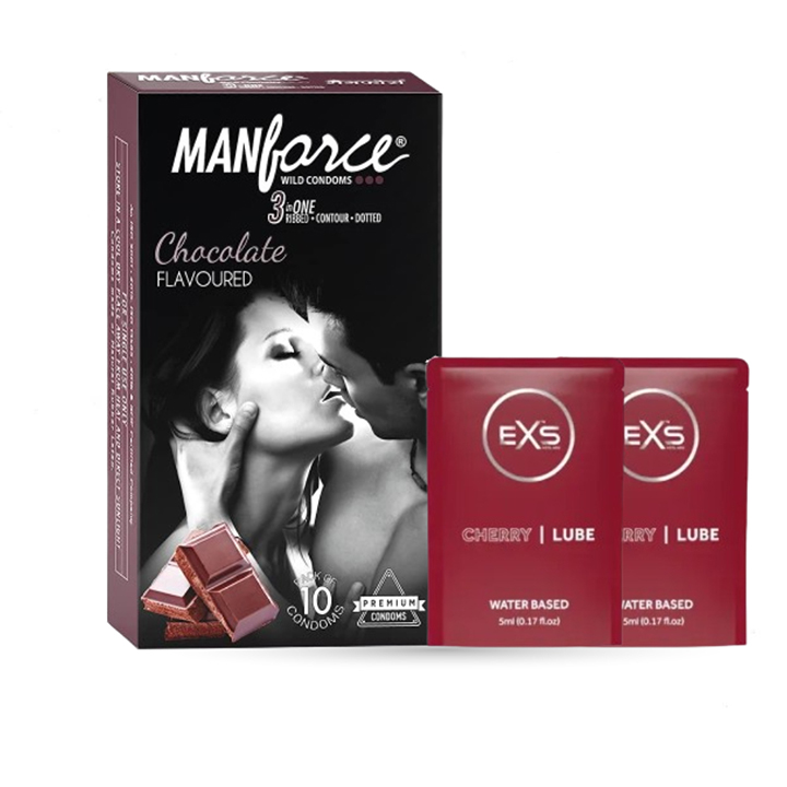 Manforce Chocolate Flavor Condoms 10pcs Pack & EXS CHERRY Flavored Water Based Lubricant 5ml 2 Pack | Wedding, Honeymoon, Valentine Couple Combo Pack