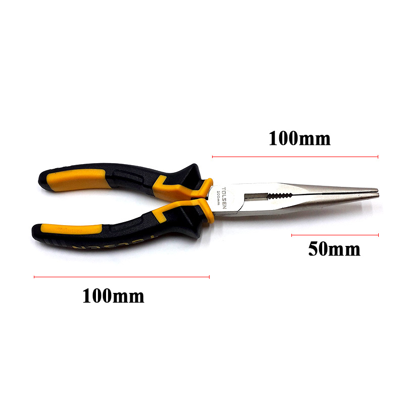 Introducing the TOLSEN 8" Long Nose Pliers (200mm) TPR Handle 10007 - Kings Trading, a must-have tool for any DIY enthusiast or professional. Made of high-quality forged steel with a nickel plated finish, these pliers are built to last. The two-tone soft plastic grips with grip ridges on the jaws provide a comfortable and secure grip, while the PVC anti-slip handles ensure maximum control. Equipped with wire side cutting blades, these pliers are perfect for cutting and bending wires. The TOLSEN 8" Long Nose Pliers (200mm) TPR Handle 10007 - Kings Trading are packed by PP card and are certified original brand TOLSEN. With its superior quality and durability, these pliers are a great addition to any toolbox.